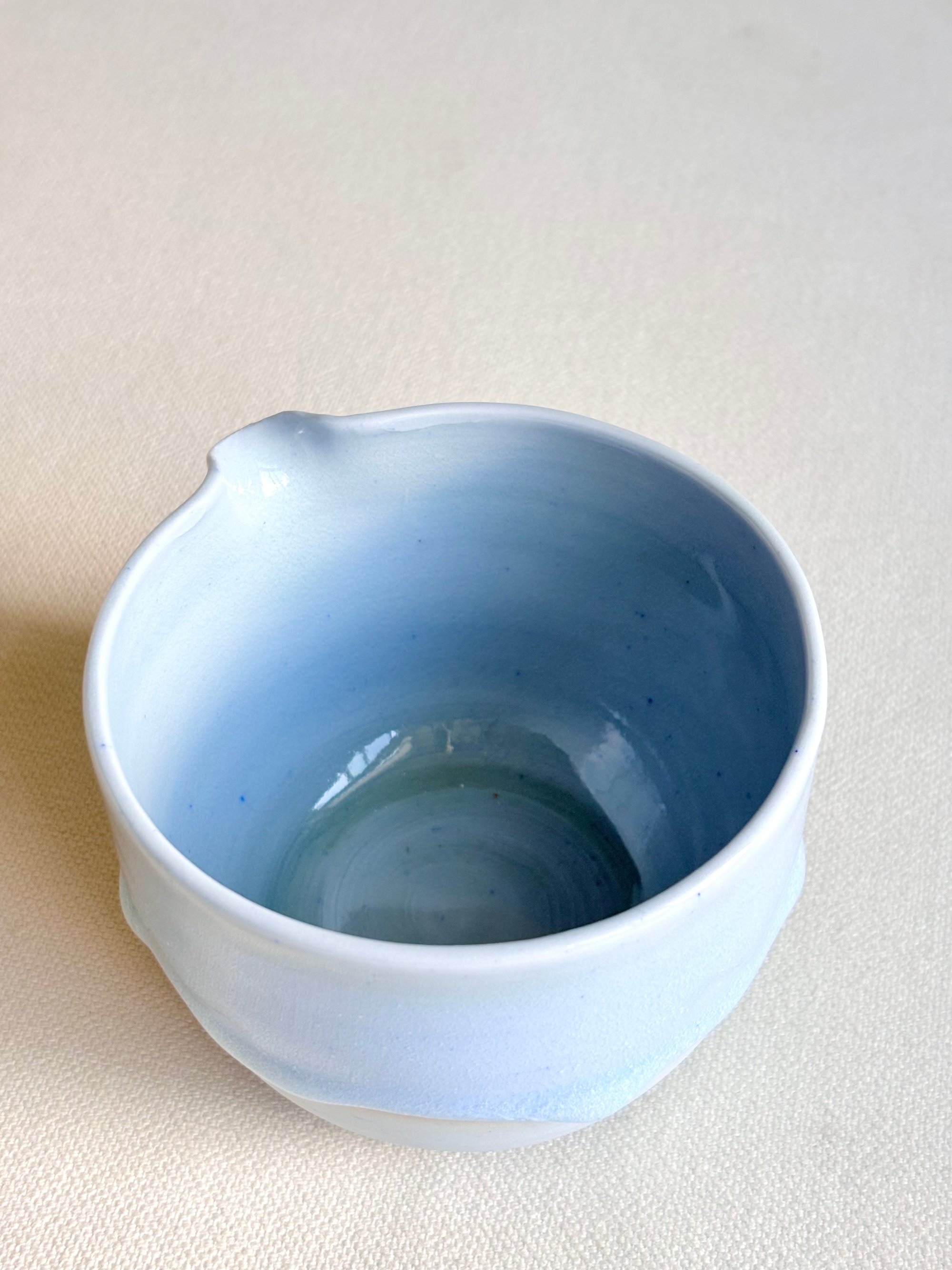 Wheel- thrown in small batches using hand pigmented porcelain, this matcha bowl brings a soft blue hue to your tea ritual. The interior features crackling, the exterior features a fluid aquamarine toned glaze that drips organically. Color variations and marking are part of the nature of handmade work and reflect the character of each piece.