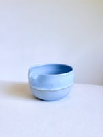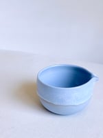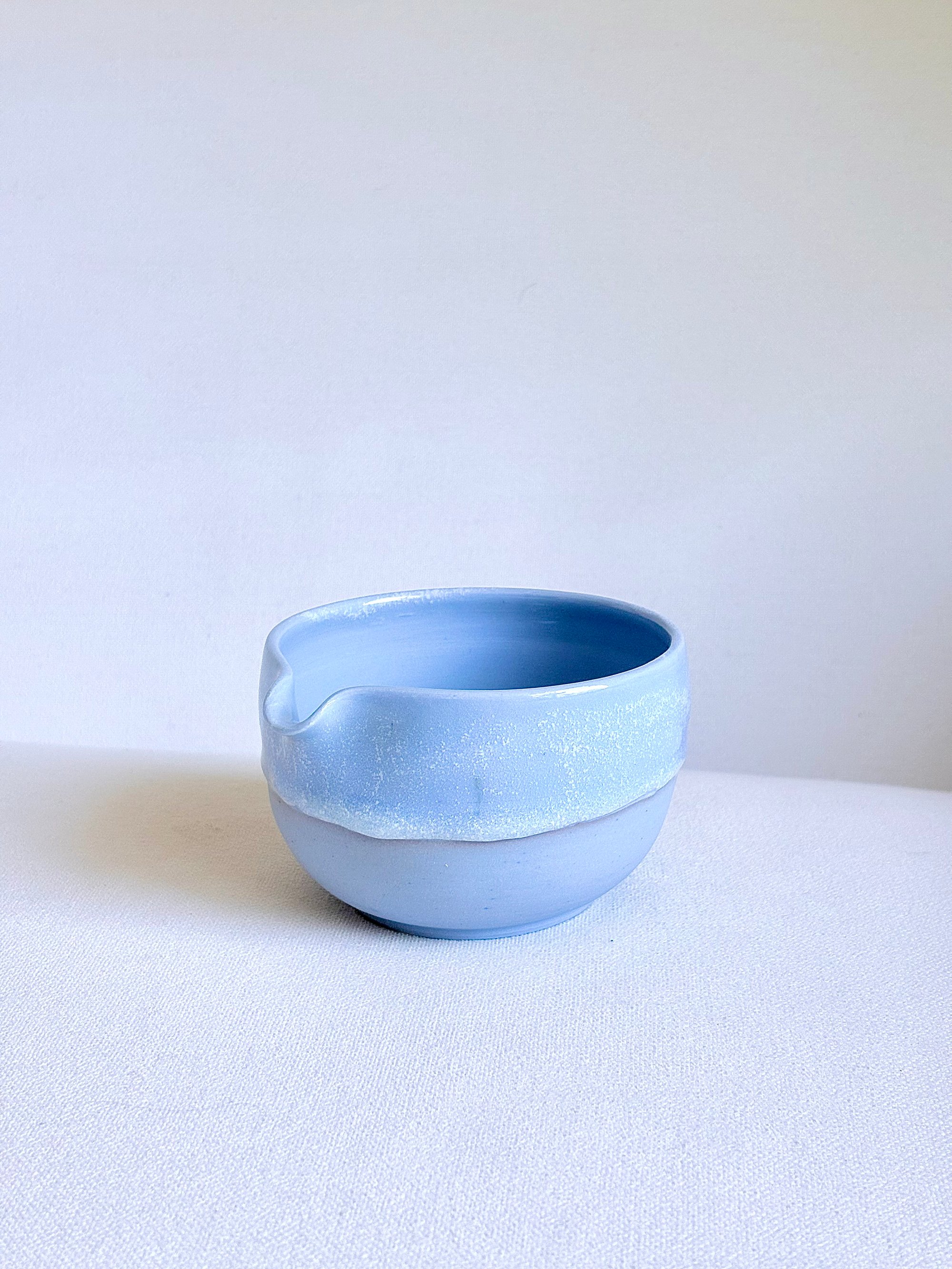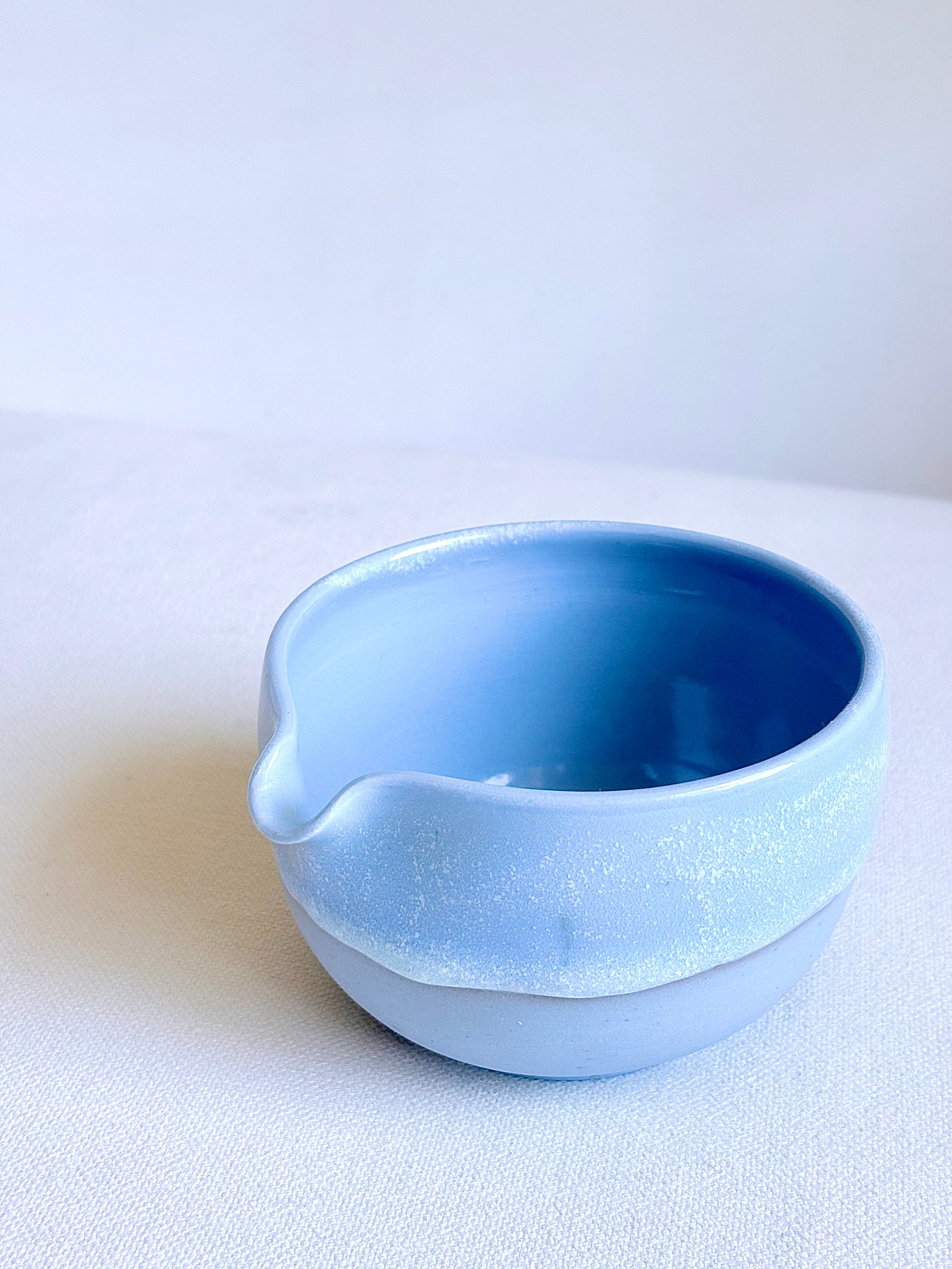 Wheel- thrown in small batches using hand pigmented porcelain, this matcha bowl brings a blue hue to your tea ritual. The exterior features a fluid blue toned glaze that drips organically. Color variations and marking are part of the nature of handmade work and reflect the character of each piece.