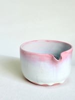 This dreamy piece is hand thrown on the potter's wheel in pigmented pink porcelain, then brushed with a brighter hue of pink clay slip throughout. An opalescent glaze is applied for the finish. As a result, this piece captures the fleeting beauty of a pink sky at sunset with dips of opalescent glaze at the base. The bottom portion is left unglazed to reveal the natural texture of clay.
