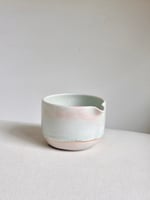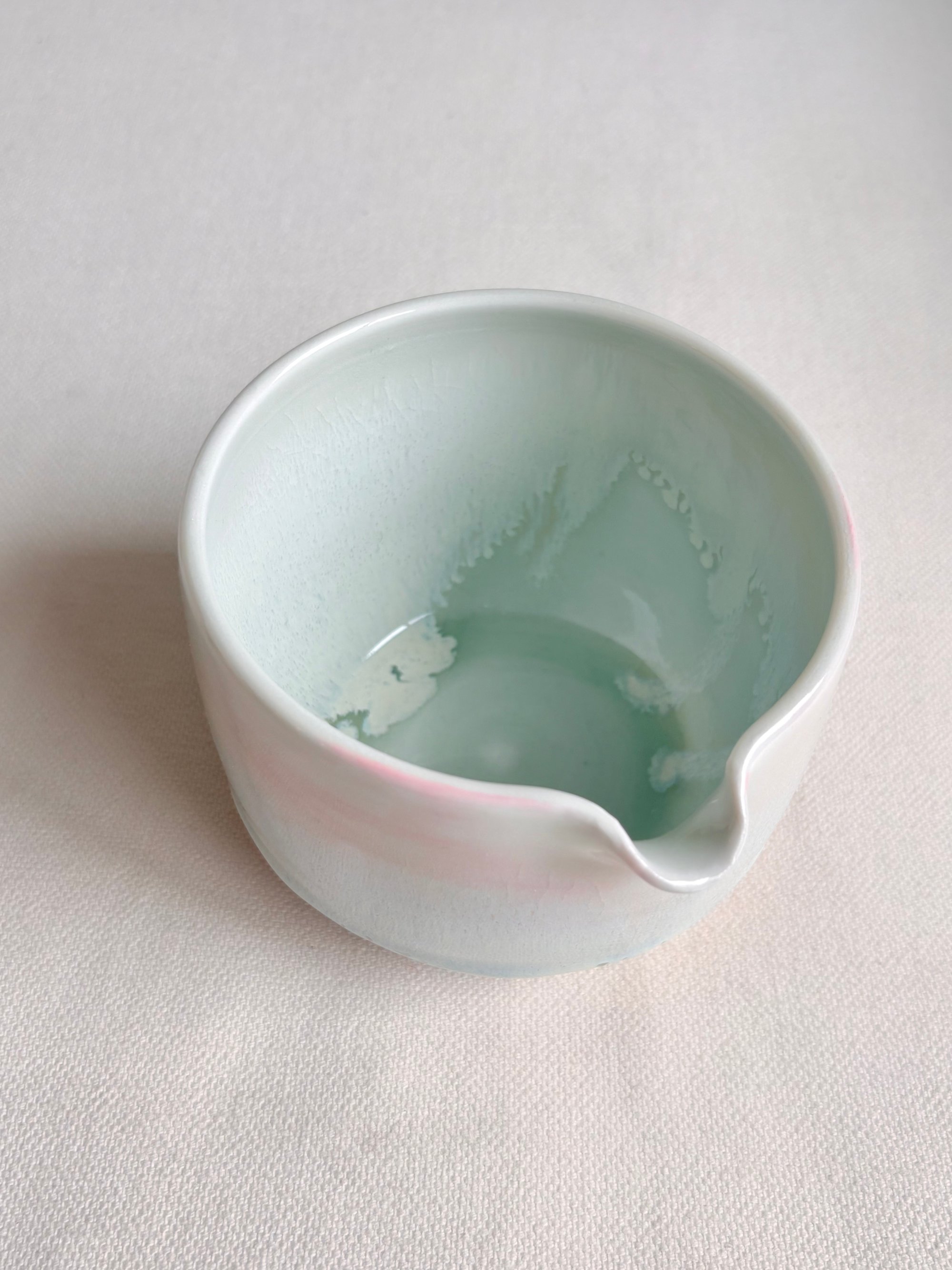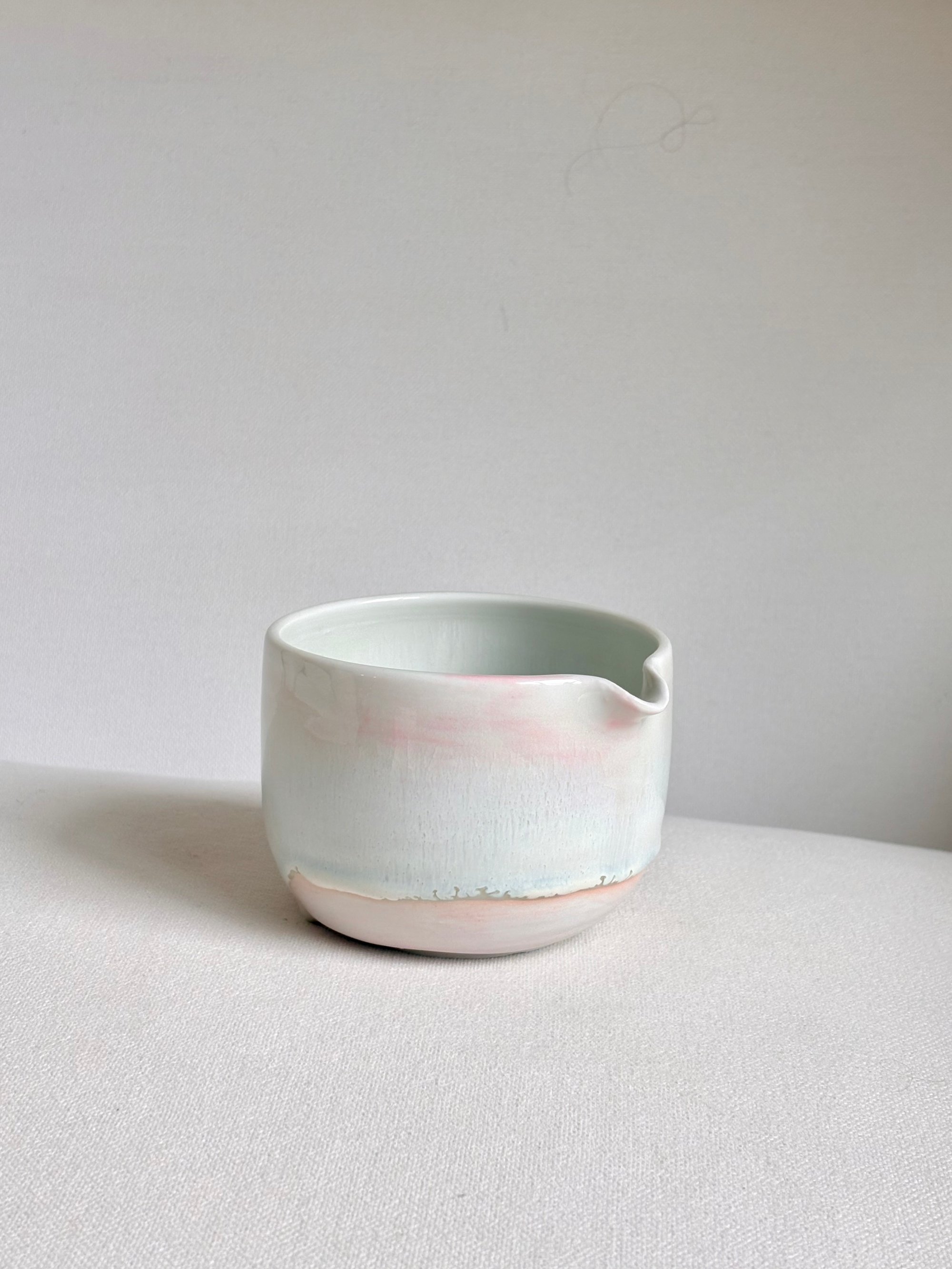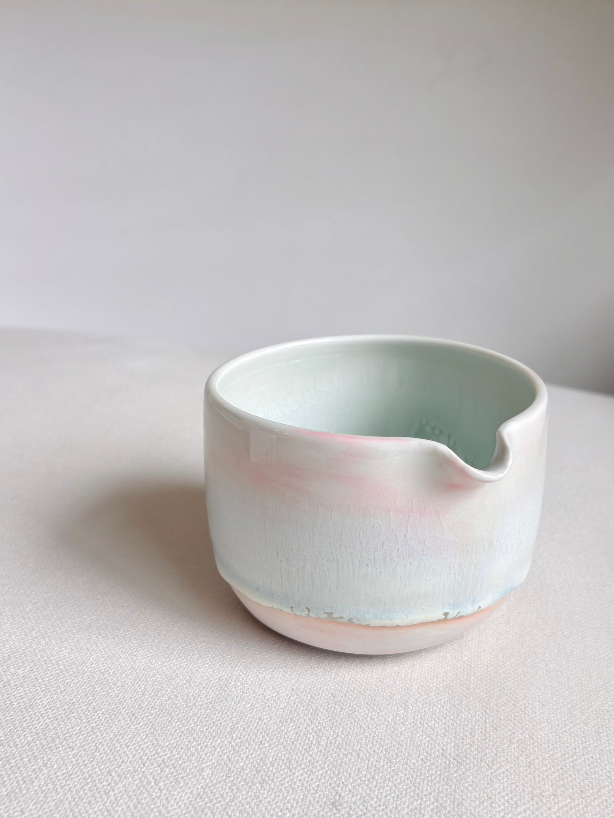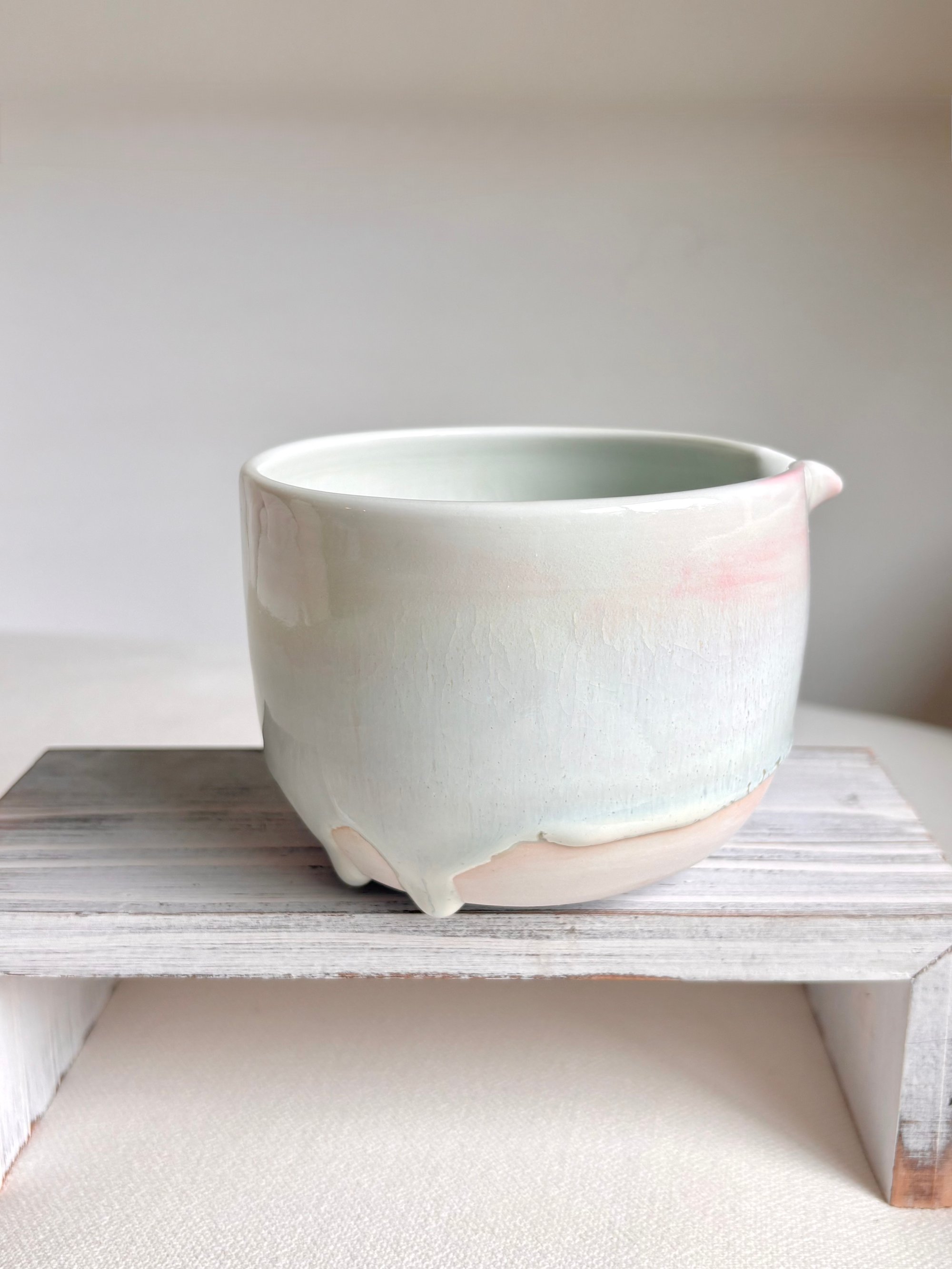 This dreamy piece is made with porcelain in pink. An floating opalescent glaze is applied throughout which results in an ethereal and drip effect. There is subtle crackling effect throughout the piece, which is the nature of this glaze and it perfectly safe to use. The bottom portion is left unglazed to reveal the nature beauty of the pigmented clay.