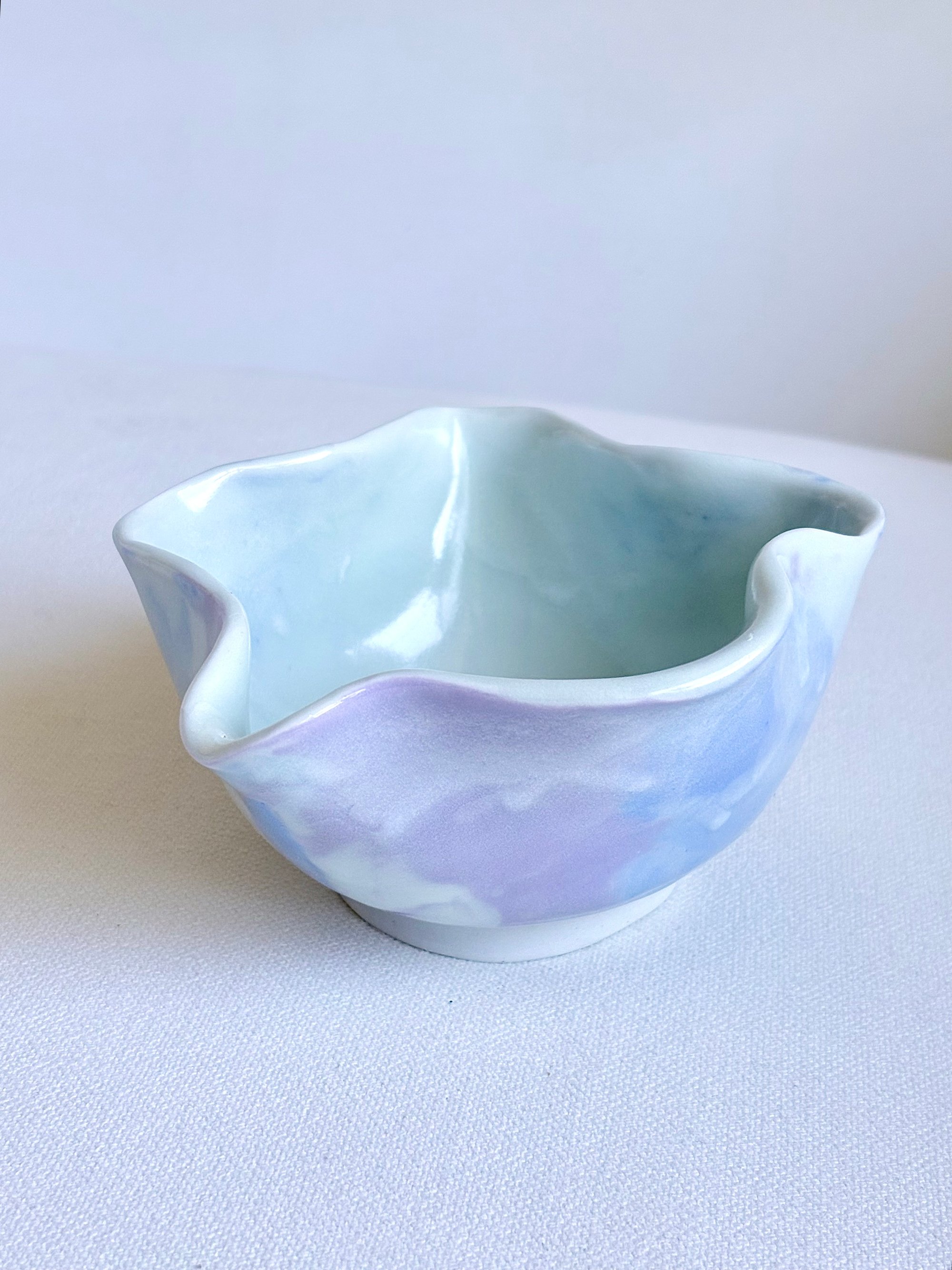This dreamy piece is made of blue and lavender porcelain, hand built with a slab then molded into a softly sculpted form. Generous in size, ideal for matcha lovers who favor a larger base to work with. A subtle cloud like glaze is applied as accents throughout. Somewhere between function and art, made for whisking matcha and linger in the moment.