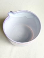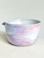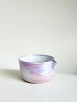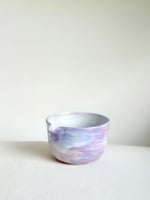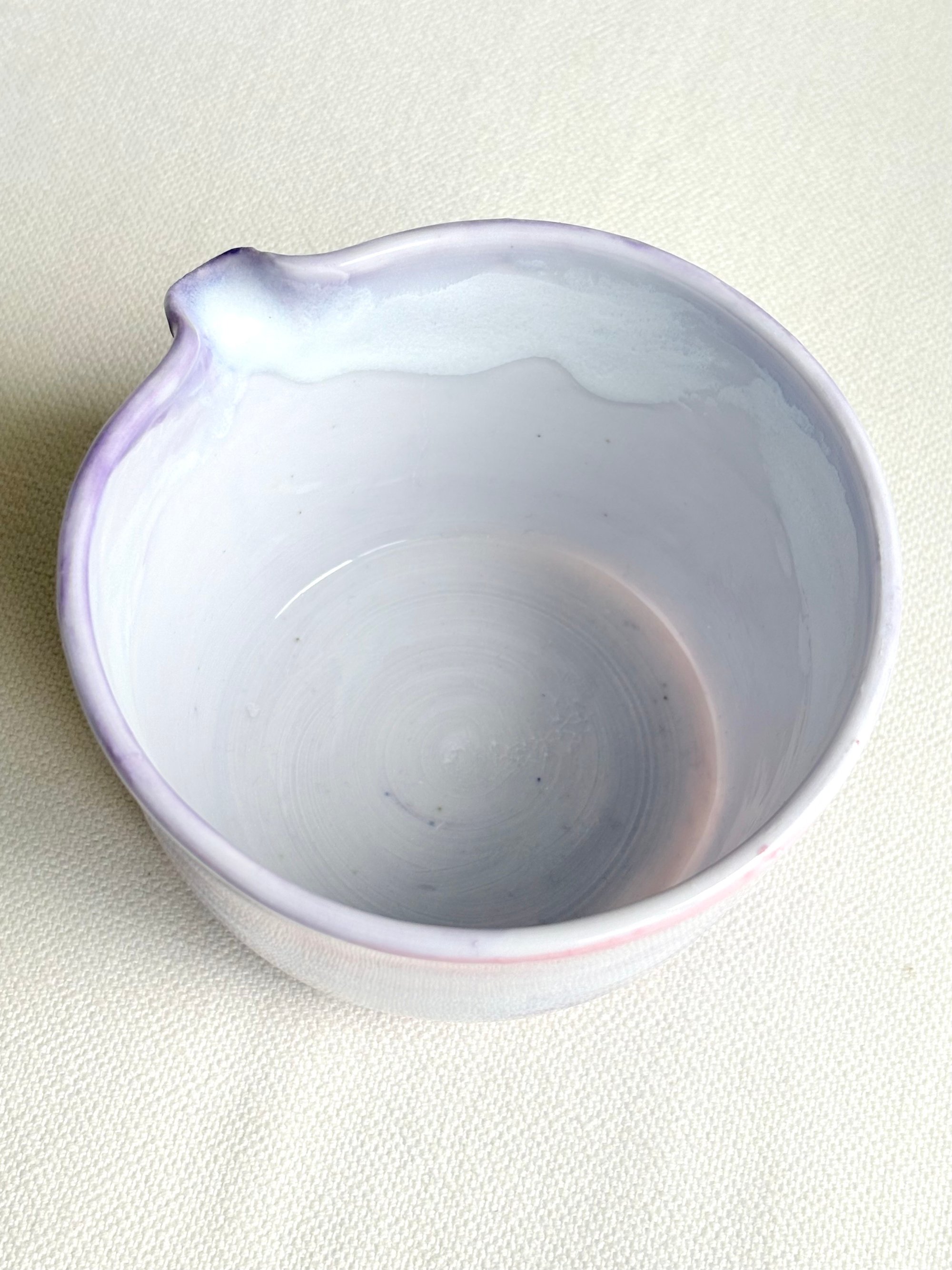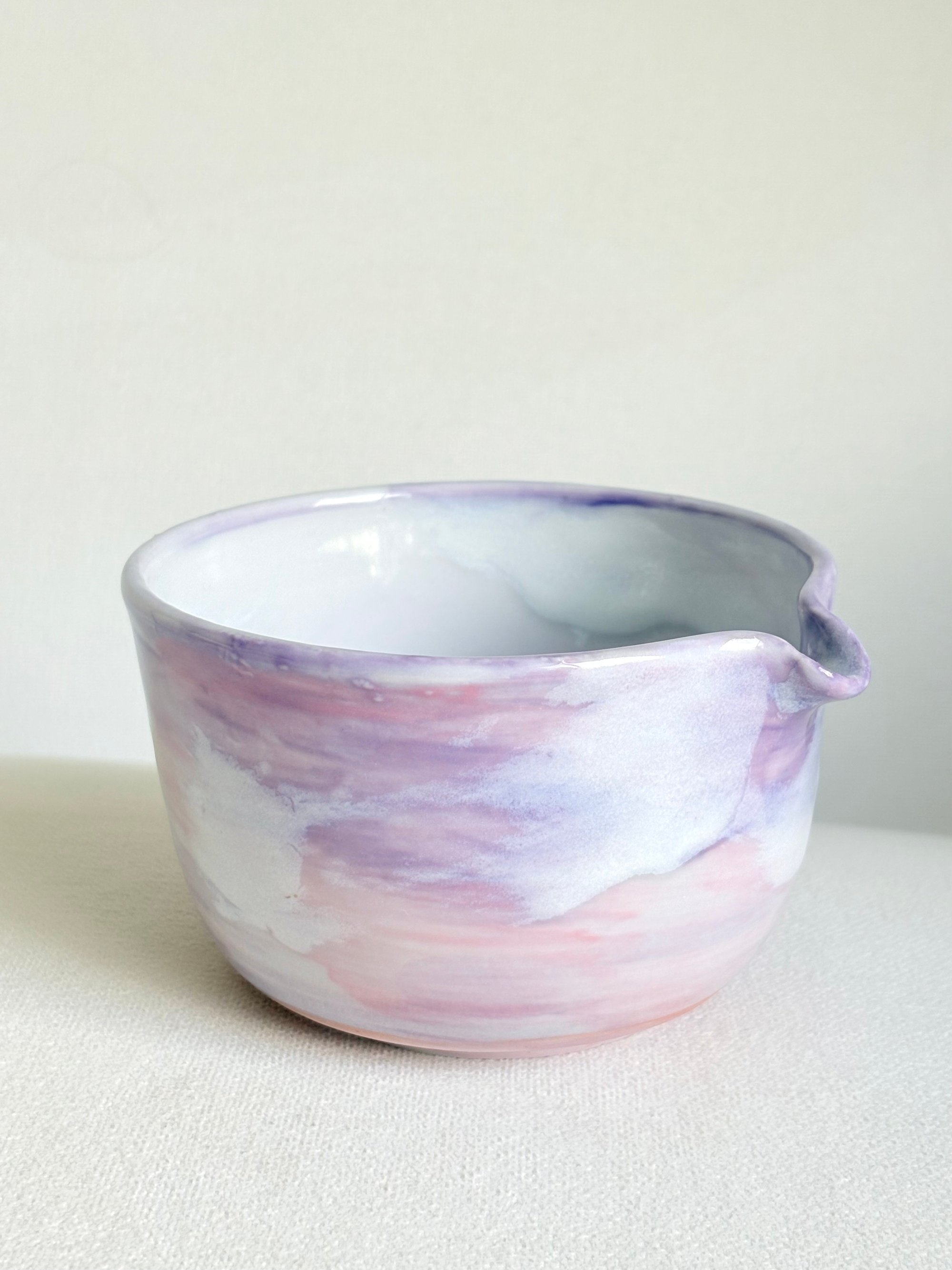 This dreamy piece is hand thrown on the potter's wheel in pigmented lavender porcelain, then brushed with a combination of pink, blue and lavender clay slip throughout. A clear glaze is applied for the finish, with white floating glaze as accents throughout. As a result, this piece captures the fleeting beauty of a pink and lavender light through clouds at sunset. The bottom portion is left unglazed to reveal the natural texture of clay. Please note there are subtle marking on the inside of the piece, which is the nature of hand made ceramics.
