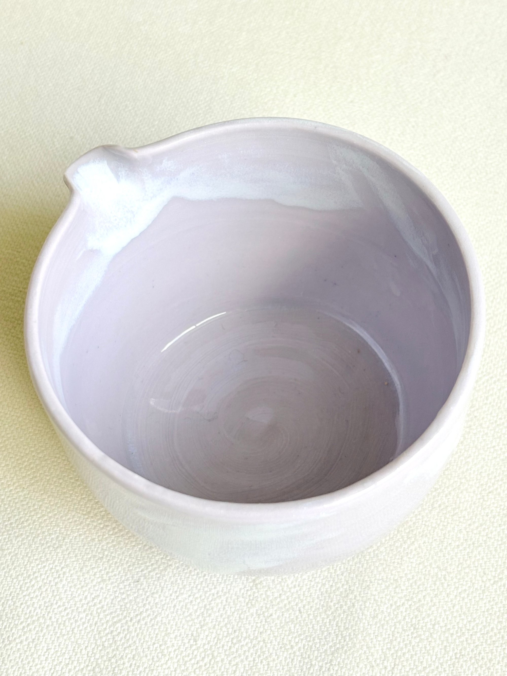This ethereal piece is made of pigmented porcelain clay in lavender. A clear glaze is applied to finish the piece with white floating accents throughout. It is like an abstract painting of lavender and white as a matcha bowl. Beautiful to look at and lovely to use.
