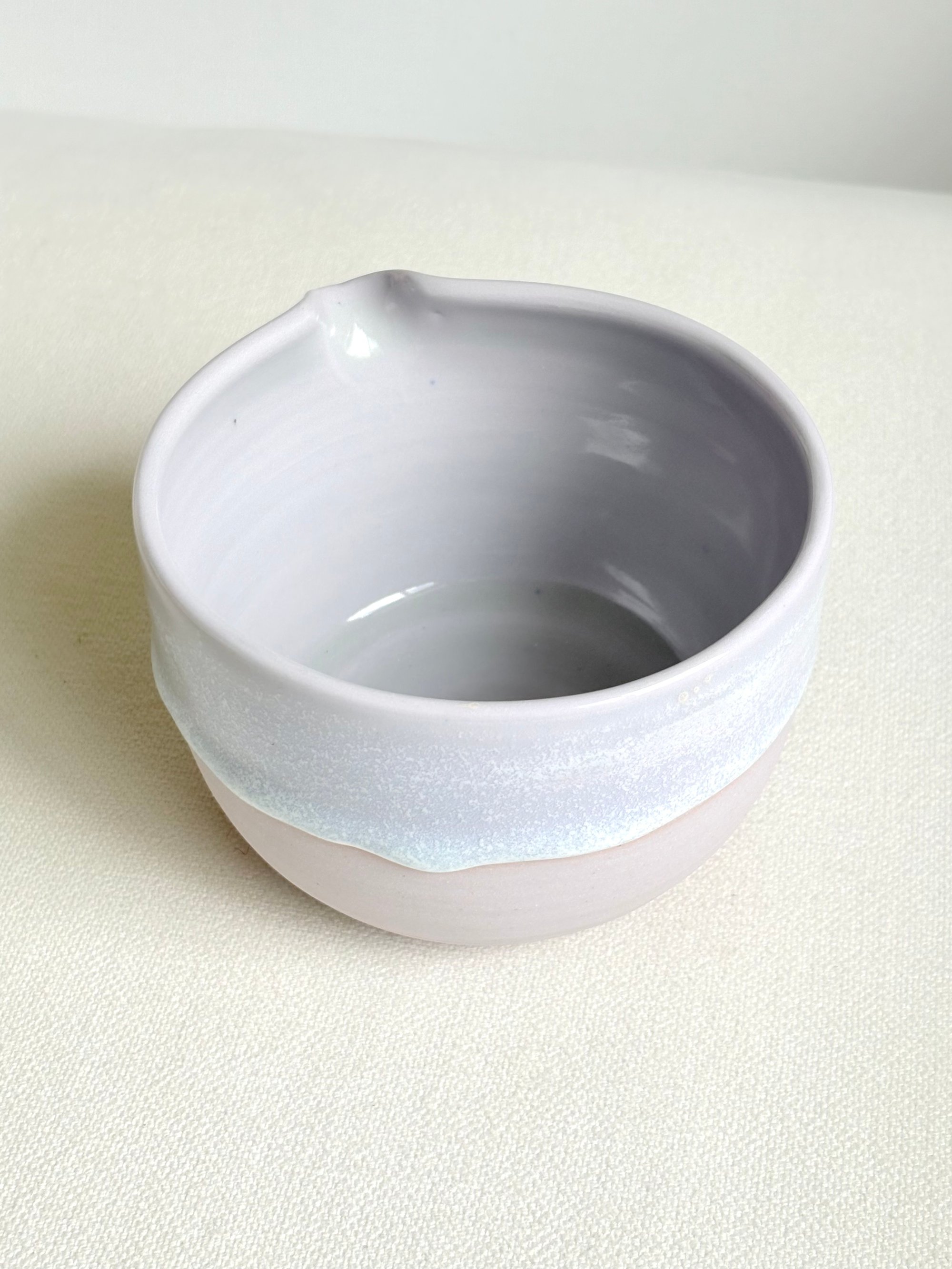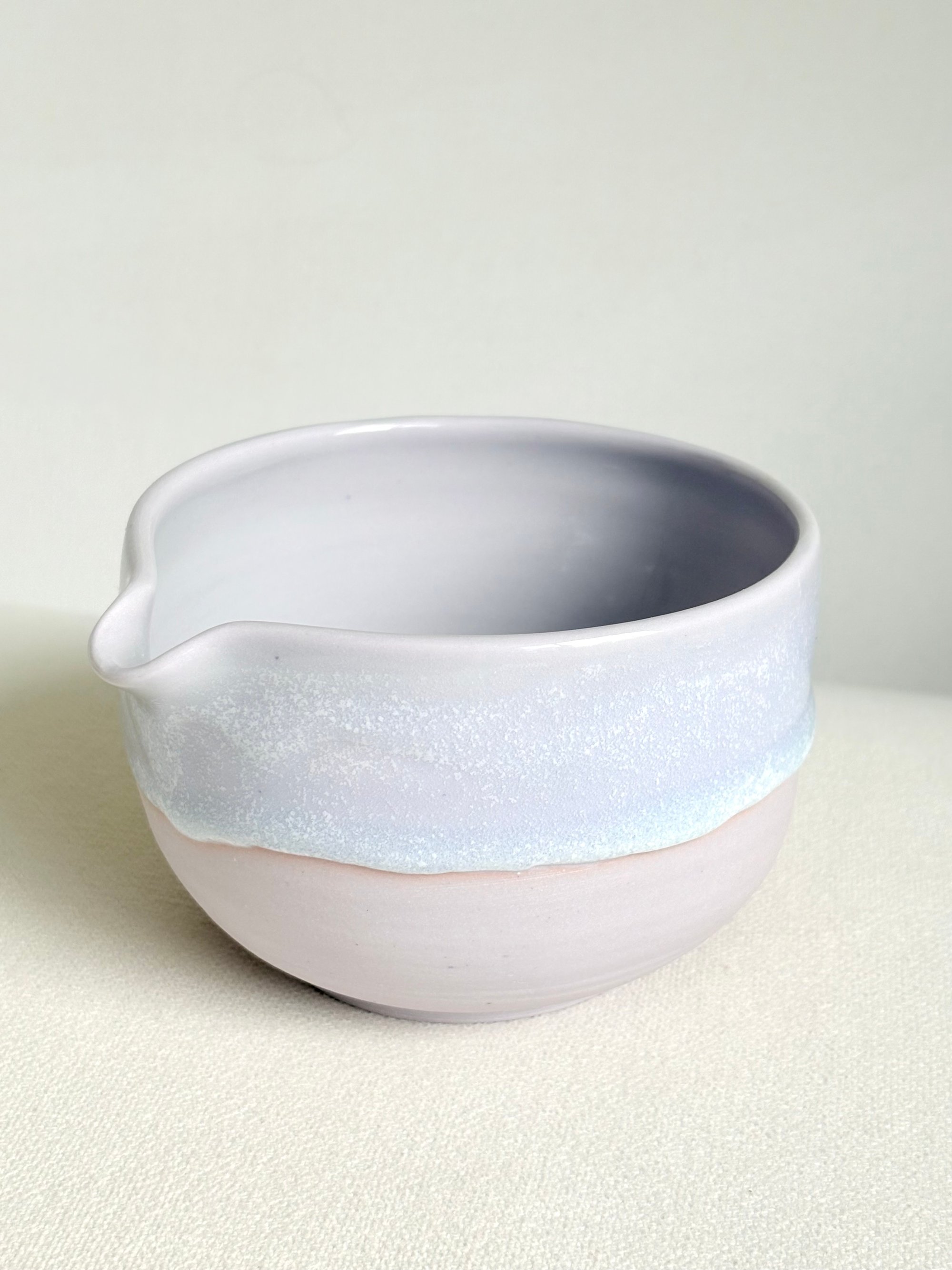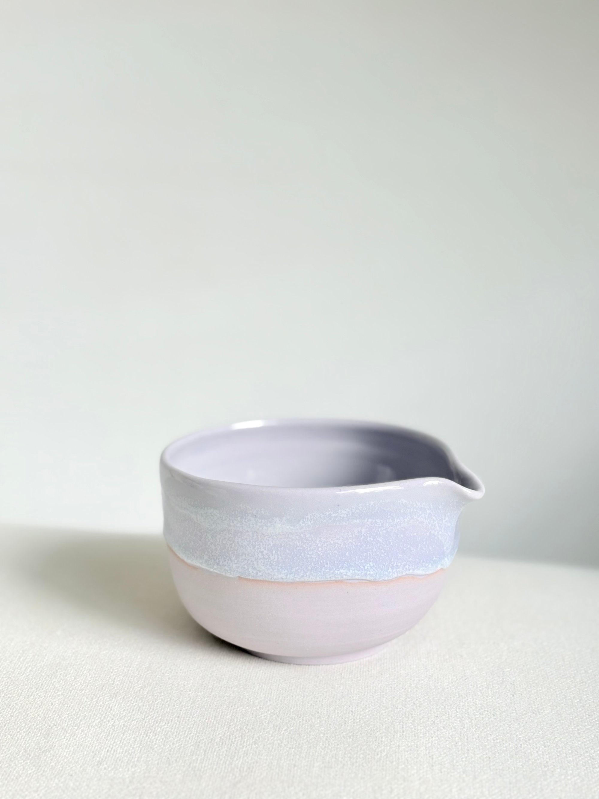 Wheel- thrown in small batches using hand pigmented porcelain, this matcha bowl brings a soft lavender hue to your tea ritual. The interior features crackling, the exterior features a fluid aquamarine toned glaze that drips organically. Color variations and marking are part of the nature of handmade work and reflect the character of each piece. Please see last photo for size comparison with a regular size piece.