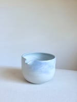 This dreamy piece begins with premium quality white porcelain. Blue pigment is then added to the porcelain clay to create the base color. The marbled patterns come from wheel-based techniques that are part design and part improvisation. An clear glaze is applied with a floating glaze that creates soft, hazy effect. Color variations, crackling and light markings are part of the nature of handmade work, and reflect the character of each piece.