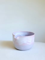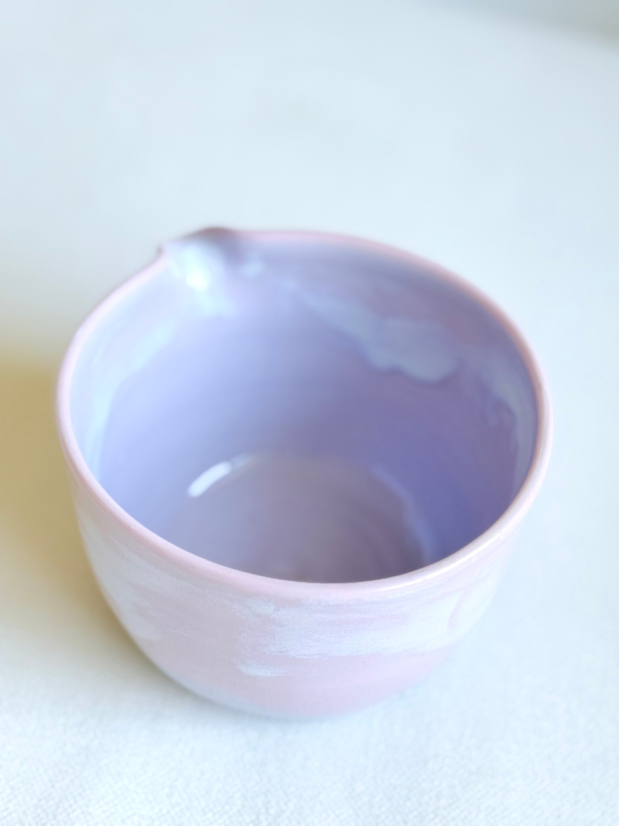 This ethereal piece is made of pigmented porcelain clay in pink, lavender and white. Colored clay was placed strategically during wheel throwing to create this gradient and marble effect. A clear glaze is applied to finish the piece with white floating accents throughout. It is like an abstract painting of pink, lavender and white as a matcha bowl. Beautiful to look at and lovely to use.