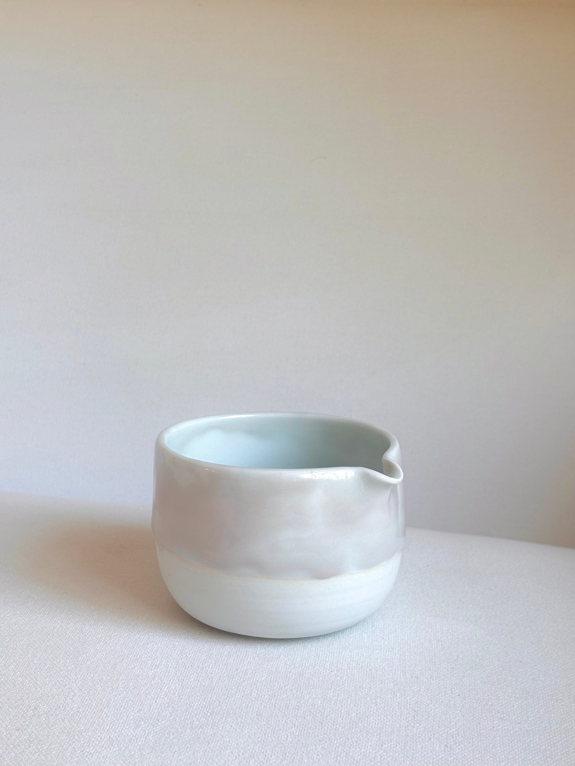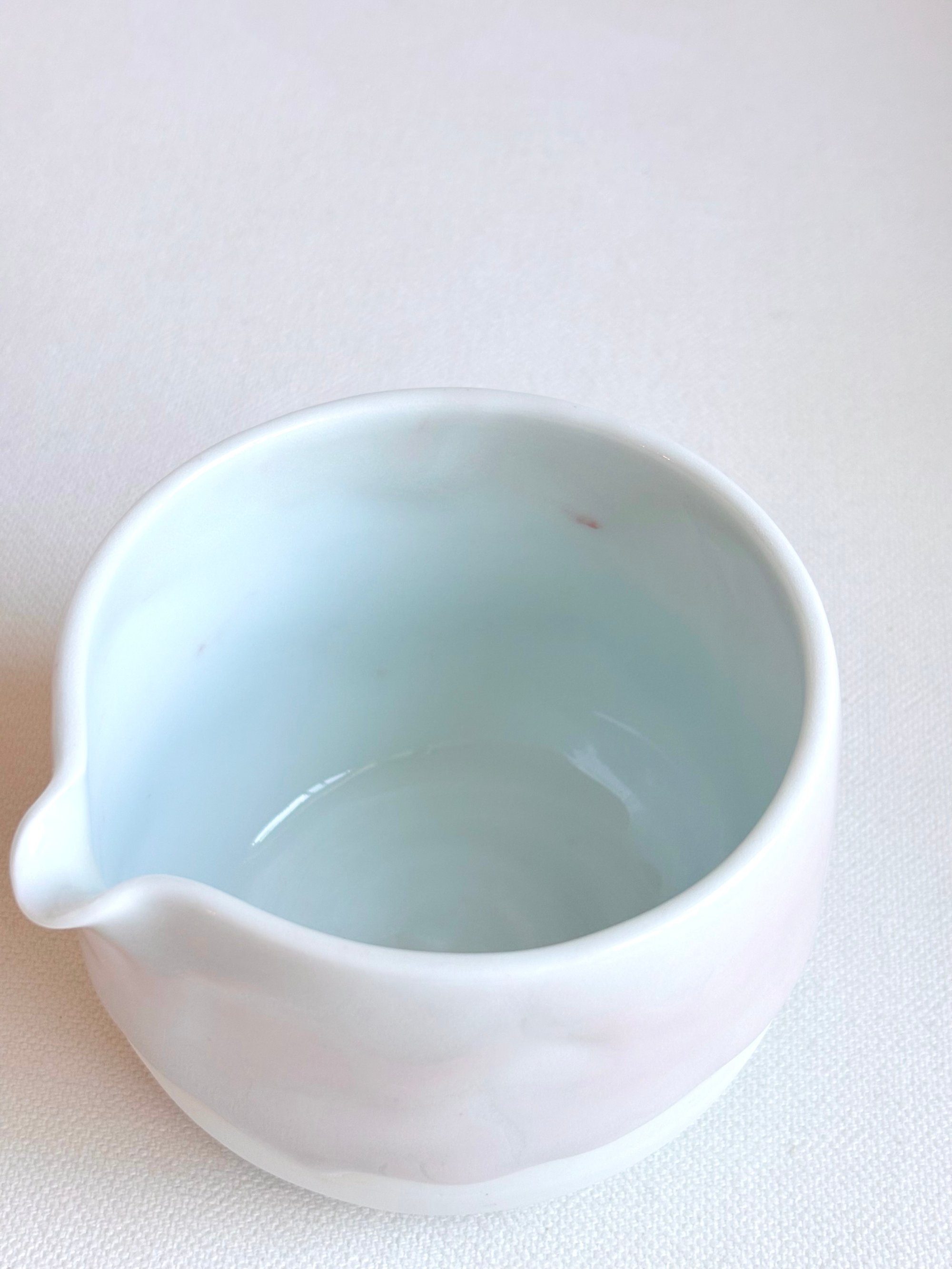 Wheel- thrown using premium white porcelain, this matcha bowl brings a rosy hue to your tea ritual. The interior is glazed with a clear glaze with a hint of mint, the exterior features a fluid glaze with a hint of rose that drips organically. The bottom half of the exterior is unglazed, revealing the beauty of the natural clay.